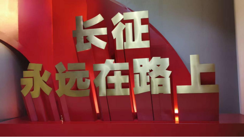 人群的目光齐齐汇聚于中央——三米高的巨型红旗装置巍然矗立,金色汉字组成的“长征永远在路上”标语在红绸上翻涌,似有战鼓声从字里行间奔涌而出。学生们自发围成半圆,有人踮脚仰视,有人举着手机将镜头对准旗面与自己胸前的校徽重叠处;讲解员的声音穿透人群:“这面旗,是八十七年前红军战士用热血染就的信仰图腾。”