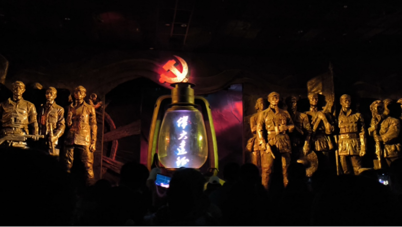 展台后方,身着八路军军装的塑像昂首而立,脚下斑驳的弹壳与墙面暗红的血色浮雕交相辉映。人群忽然静了静——有女生指着塑像磨破的袖口低语:“课本里的‘小米加步枪’,原来是这样的温度。”更多人举起手机,闪光灯在暗红的基调中明明灭灭,记录的不仅是展陈,更是与历史的对视。